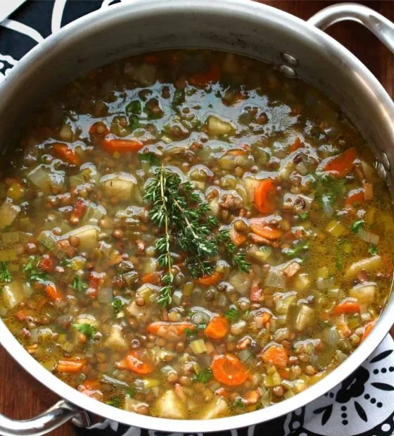 3. Add lentils, water, 3⁄4 of the onion confit, and bay leaves.